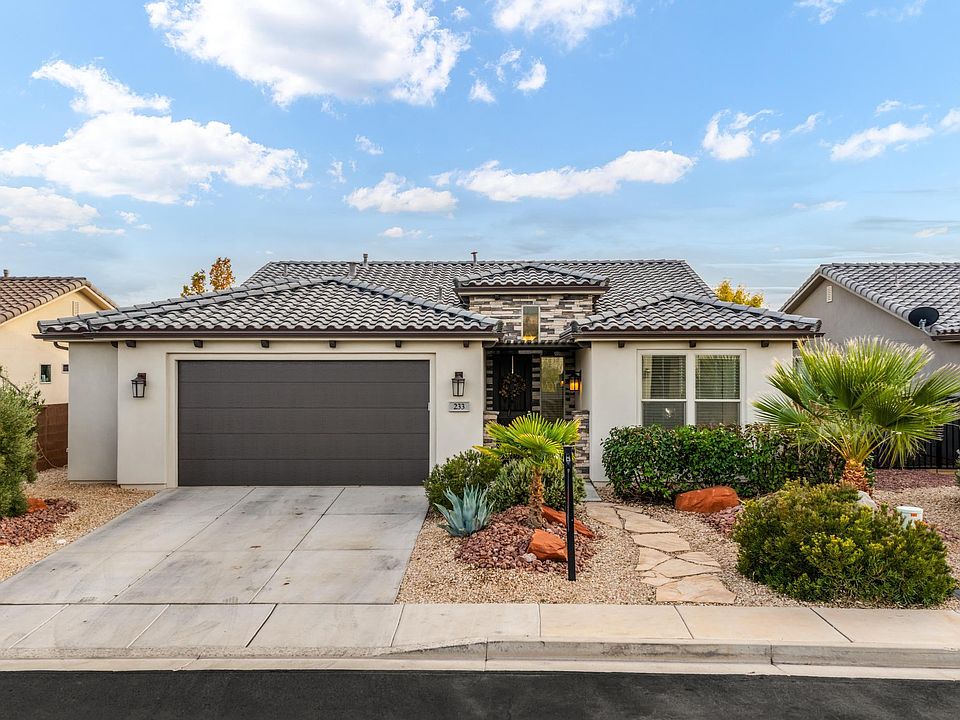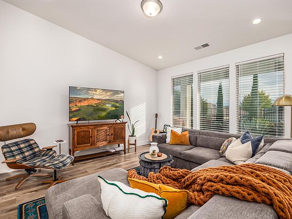 Welcome home to BRIO! Experience RESORT-STYLE living in one of the area's most sought-after communities-where over 300 days of sunshine meet easy living, endless activities, and modern comfort. This beautifully maintained 4-BEDROOM, 3-FULL BATH home is thoughtfully designed with a bright, open floor plan and soaring vaulted ceilings that create a spacious, inviting feel. The open kitchen shines with sleek quartz countertops, an upgraded appliance package, and expansive wood floors flowing seamlessly through the main living areas. You'll love the home's modern, clean design, abundant natural light, and rare EXTRA-LARGE garage-perfect for storage, hobbies, or outdoor gear. Situated on an elevated lot, this home offers scenic views and a sense of privacy above the surrounding properties. Enjoy all that Brio has to offer: indoor and outdoor pools, pickleball and tennis courts, scenic trails, a state-of-the-art fitness center, and one of the most STUNNING CLUBHOUSES around. Homes like this don't come up often-so don't miss your chance to make Brio your next home or desert retreat!