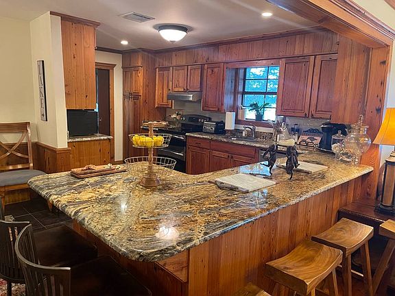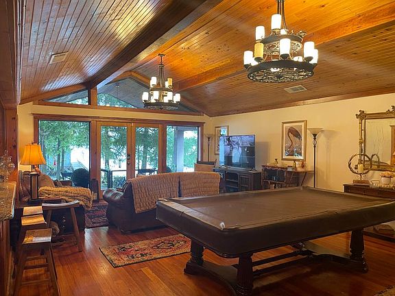 This stunning 4 bedroom, 2 bath, ranch style lake house was recently updated in 2022 and features pecky cypress cabinets in the open kitchen area and heart pine on the dining room floors. The home has exposed beams and high ceilings in the living area with all glass on the lakeside. The house sits up high overlooking the lake and has plenty of shade all day from the massive trees on the lake side. Step out onto the covered porch and watch the sunrise while you enjoy your morning coffee, or wait till sunset to view the magnificent uplighting that glows through the trees and the underwater lighting that lights the pier walkway. The pier has two boat slips inside the cypress board and bat boathouse, one pontoon slip that was just installed. The end of the dock has a high deck for sunning or diving into the deep water that this area of the lake is know for. New doors, new windows, new septic system, new security system with smart locks and a new washer and dryer. This home comes furnished.