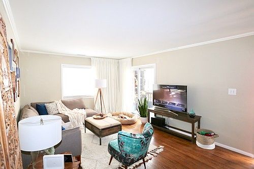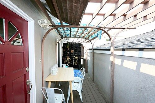 This darling 2BR/1BA upper unit has been very tastefully updated and features hardwood floors throughout, kitchen with white cabinetry and black granite countertops, updated bathroom with shower and 2 spacious bedrooms each with ceiling fans. Large open living room has a sliding door to the balcony. One garage space, extra storage space underneath the unit (large enough for surfboards!) and free shared laundry in the garage!