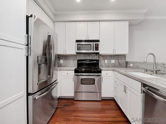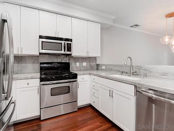 Located on the ground floor of a secure complex, this quiet unit offers a peaceful living environment enhanced by dual-paned windows that ensure a tranquil interior. The home features dual master bedrooms on the upper level, each with renovated ensuite bathrooms and spacious walk-in closets. On the first floor, the upgraded kitchen includes bar seating for four and opens up to a flowing dining and living area layout. Step outside to enjoy a serene patio off the living room. Freshly painted interiors are complemented by beautiful lighting and updated bathrooms. Hardwood flooring on the first level transitions to cozy carpet upstairs. Additional conveniences include two tandem parking spaces in a secure underground garage, in-unit washer and dryer, and central air and heat. Residents can also enjoy the shared amenities of the complex, including a grilling and outdoor patio area, as well as a gym. Located within walking distance to numerous coffee shops, restaurants, Balboa Park, Hillcrest, and Little Italy, this home offers both comfort and convenience in a vibrant neighborhood.