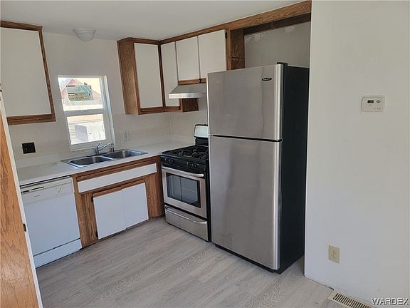 2 Bedroom, 2 Bath singlewide on fully fenced yard with 14ft swing gate with room for RV parking. Asphalt driveway and desert landscaping in front yard. Covered patio. Washer and dryer convey with sale. Property has many upgrades including new tub/shower and toilets in master and guest bathroom, new laminate flooring, new dual vanity in master bathroom. New electric panel, some new windows, new exterior siding, new paint in and out, new water heater, new gas range and hood, new stainless fridge, new stainless kitchen sink, some upgraded electrical fixtures. Indoor laundry in hallway. There is a pad for garage, 24'x26'. Old garage burned down, as well as back half of home that was rebuilt around 2020.