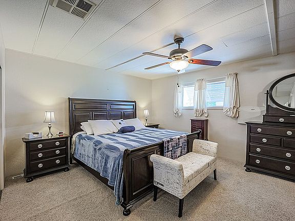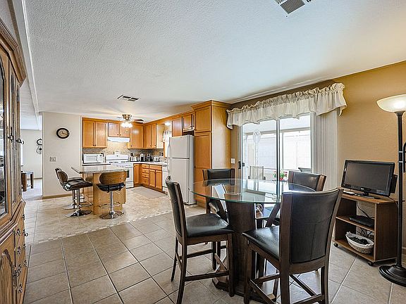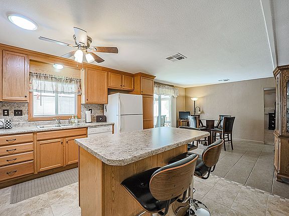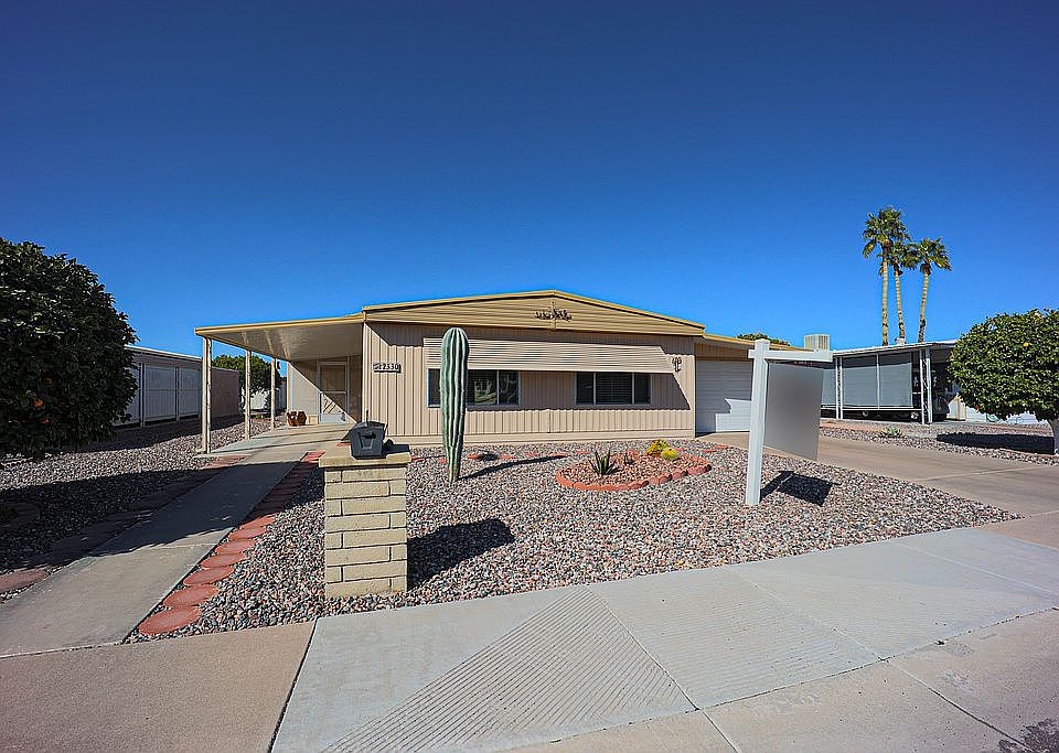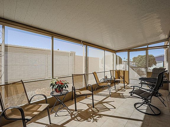 Awesome floor plan on this two bedroom, two bath home with large enclosed AZ Room. . Spacious laundry room. This home has so much storage! Lucious citrus trees. Huge workshop and hard to find garage. Parking galore! Located on quiet, interior street in popular Apache Wells 55+ community.