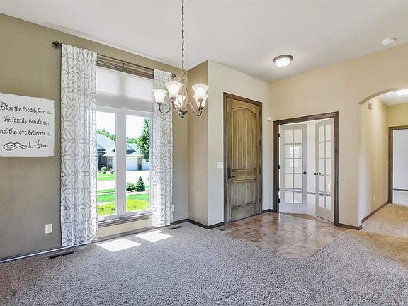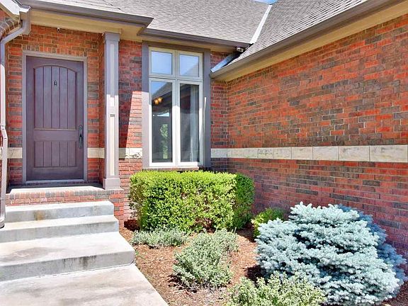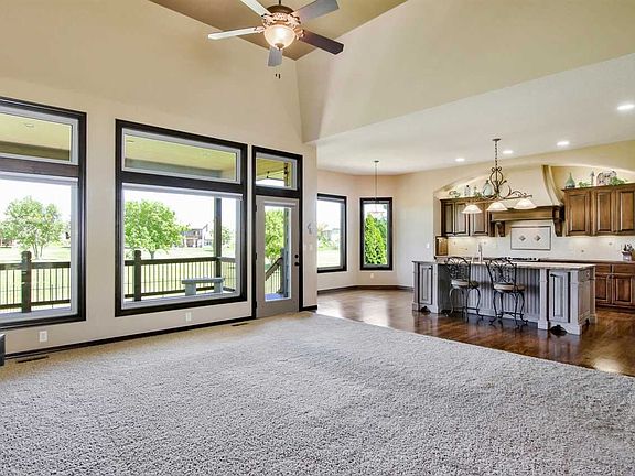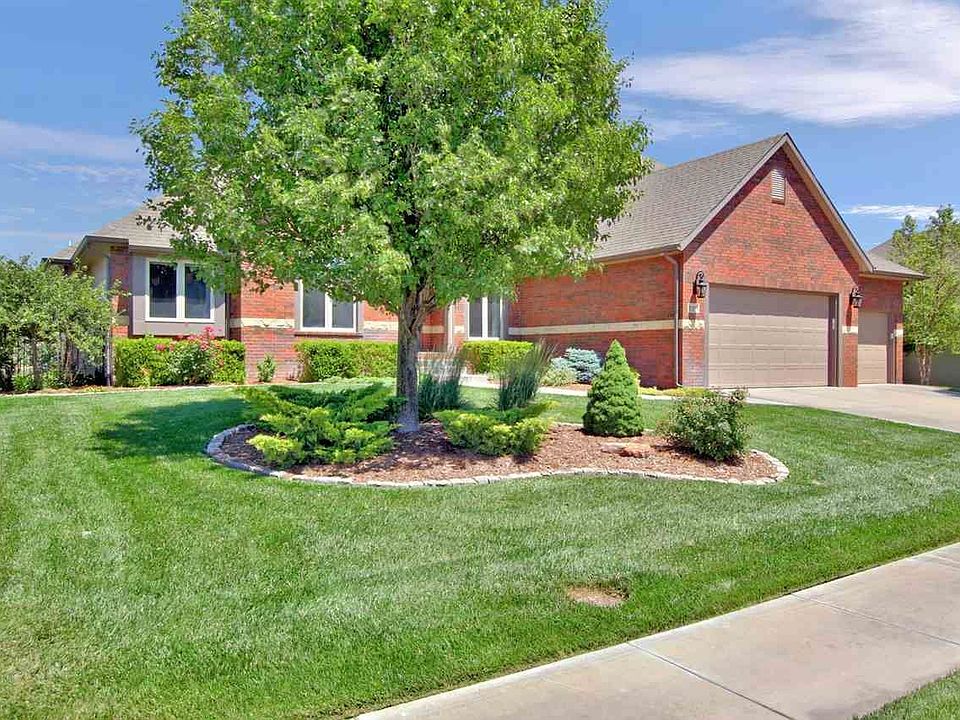 This is it! Fabulous ranch situated on one of the best lots in The Oaks offers incredible golf course views and an East-facing backyard. The well appointed open floor plan is ideal for entertaining and every day living. Windows spanning the back of the home soak the living spaces with natural sunlight and allow for panoramic views of the course. Enjoy high ceilings, spacious rooms, formal dining, two fireplaces, beautiful architectural details throughout, built-ins, hardwood flooring, generous windows, offices on each level, security system and an insulated/sheetrocked three car garage. The open kitchen is well equipped for any cook with a large center island/eating bar with granite countertops, stainless steel appliances, under cabinet lighting, decorative vent hood and an exceptional walk-in pantry. Retreat to a lovely master suite offering a coffered ceiling, door to the deck, vanity with dual sinks, corner soaker tub, separate tile shower, and a walk-in closet. A second bedroom and office with french doors complete the main level. Entertaining is effortless in the fully finished walkout basement showcasing a rec/family room, beautiful wet bar with a dishwasher, two bedrooms, bathroom, office, and storage. The lower level office offers endless possibilities as a playroom, exercise room, or craft room. Extend your living space outdoors in a fenced backyard with a covered composite deck with a fireplace, concrete patio, sprinkler system, and an irrigation well. Benefit from lower taxes compared to new construction; the specials pay out in 2022. Conveniently located within walking distance of Derby Hills Elementary and The Derby Golf and Country Club amenities, this well maintained ranch, in the heart of the growth in Derby, is a must see!