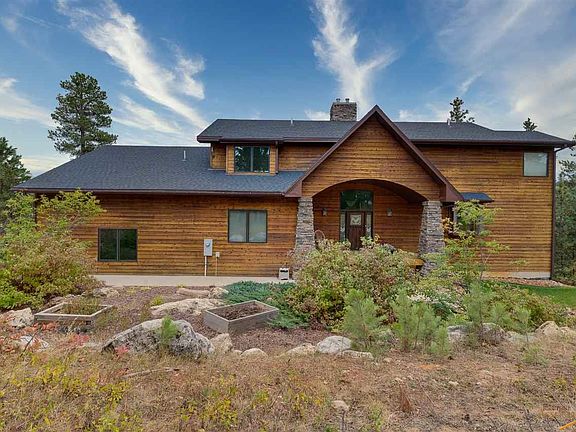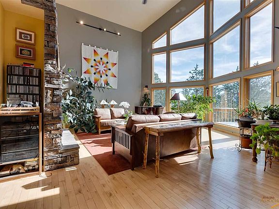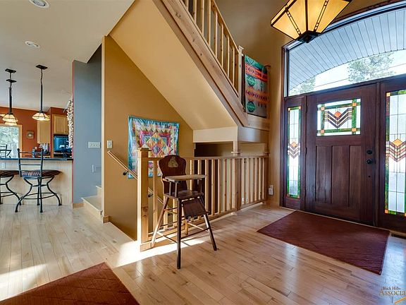 Aspen Hills is one of the most beautiful developments just 15 minutes from Spearfish. Aspen, Oak & Pine trees surround this spacious 1.5 story home. Wood siding helps the home blend naturally into the landscape. Walking up to the front door you will notice the unique eyebrow tongue and groove porch ceiling. The door features a stained glass window and is flanked by leaded glass sidelights. Natural colored maple wood floors welcome you in the foyer that leads to the huge living room with a wall of windows (Pella windows through out the house) reaching two plus stories high with a breathtaking southern view. There are two nice-sized bedrooms and full bath on the main floor. The south facing bedroom has sliding doors out to the deck. A practical mudroom leads in from the three-car garage. The chest freezer in the garage will stay. The dining room shares the beautiful southern exposure with the living room.