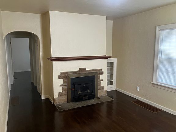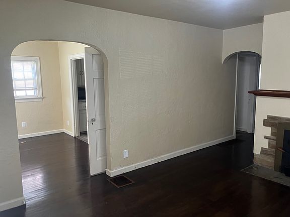 Step into this delightful 3-bedroom, 1-bathroom home. You'll be greeted by beautiful wood floors that flow throughout the home, leading you through elegant arched doorways. The living area features a decorative fireplace, adding a cozy touch to the space.