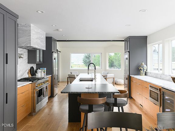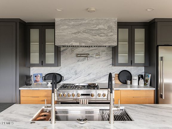 impressive ambiance, and the windows framing the expansive 1,300 sq ft deck offer uninterrupted views of the surrounding natural landscape. The chef's kitchen is a culinary haven adorned with a tasteful mix of marble and granite accents, seamlessly bridging indoor and outdoor living. High-end appliances, including a Monogram double oven and a 6-burner stove, along with separate refrigerator and freezer units, an ice maker, dishwasher, and beverage fridge, elevate the cooking experience. An