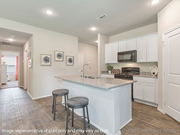 The Elgin plan is a beautifully designed single-story home featuring 4 bedrooms and 2 bathrooms. The welcoming foyer leads into the open-concept kitchen and living area, perfect for modern living and entertaining. The kitchen includes a breakfast bar, elegant countertops, stainless steel appliances, and a convenient corner pantry.