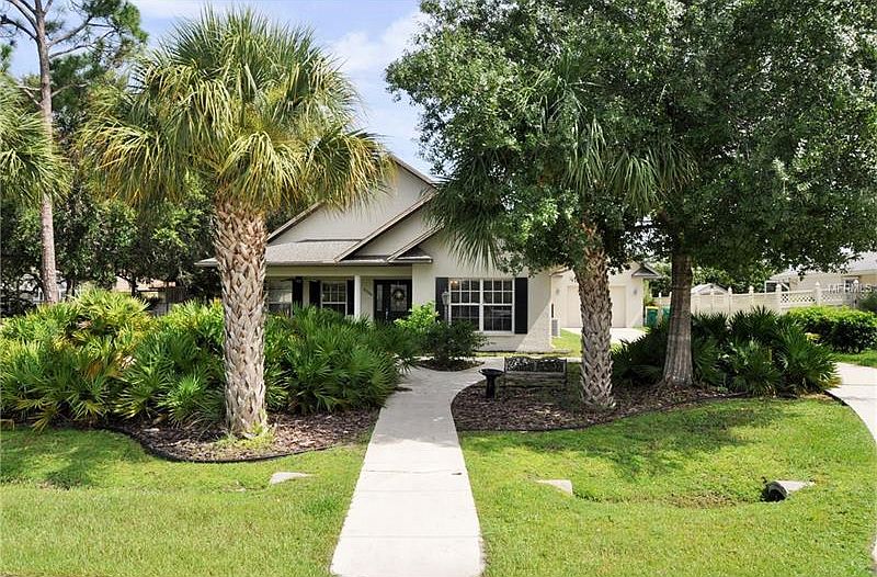 Highly sought after Section 15, this adorable home is nestled among mature landscaping and oak trees with an inviting front porch. Upon entry, you are greeted by an open space for the living room, dining room and kitchen with cathedral ceilings and windows all around for a bright sunny interior. Tastefully decorated with laminate wood floors, white kitchen cabinets, breakfast bar and decorator lights. Master bedroom has cathedral ceilings, large walk in closet and spacious bathroom with walk around shower. Split bedroom plan, each bedroom with a full bathroom. Inside laundry room with stackable washer / dryer and tankless water heater. A French door through the back of the house leads to a brick paver covered screened lanai and then to the detached garage. Garage building houses a full gym or easily convert to a home office or workshop, hurricane safe room currently used as a spa / sauna (does not convey) room and a one car garage. Plenty of parking with garage located in the back, utility shed and additional storage above garage. Don't miss this affordable home in a great conveniently located neighborhood!