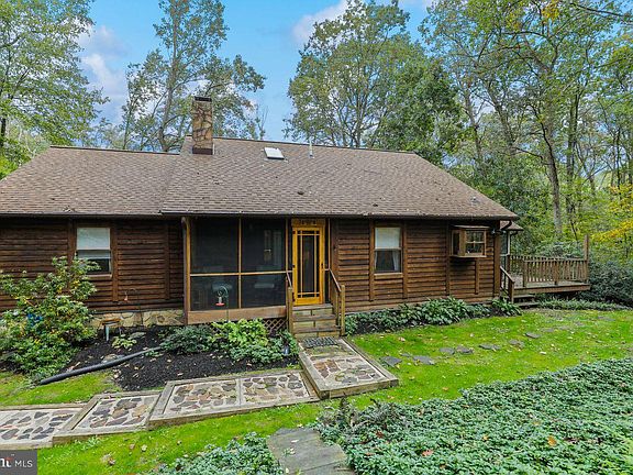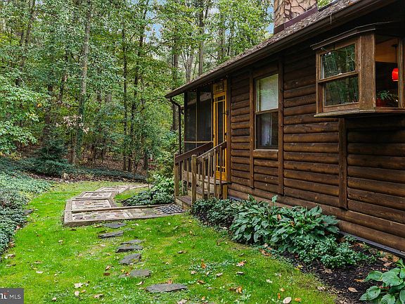 Ever thought of living in the woods? But you don't want to be far from shopping, entertainment and conveniences. This traditional log home is for you. Norman Rockwell would love it. It could be yours for the holidays. The home sits on 4.47 private wooded acres with a stream. This community is rustic while conveniently located. This home has many upgrades and creature comforts. The house and spacious detached garage have new roofs. The basement offers potential for additional finished space. It already has a new bath with laundry hookups. While floors in most rooms are hardwood, the primary and second bedrooms have new wall to wall carpet. The primary bathroom was remodeled in 2021 with custom vanities and a marble floor. The kitchen was remodeled in 2022 with upgraded cabinets and appliances. and a slate floor. The spacious living room has a great fireplace with a wood burning insert for efficiency. There is a wonderful screen porch and decks for indoor outdoor living. Don't miss this rare opportunity. Great financing through USDA. No money down to qualified buyers.