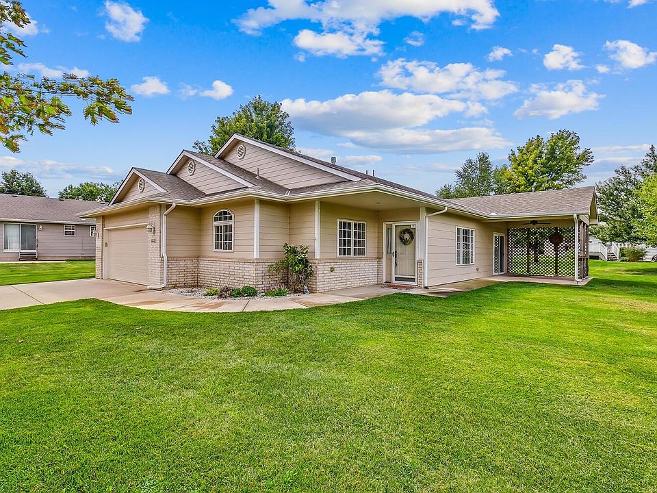 Zero entry patio home in The Lochs at Aberdeen and located in the Maize School District! Situated on a nice lot with great curb appeal. Oversized living room with gas fireplace, large kitchen with pantry, built in desk, eat in dining space. Main floor laundry room. Master suite with walk in closet that is also a concrete storm room, large master bath with two vanities and shower, oversized second bedroom with two closets, and home office space with direct access to the covered patio. The covered patio has LED lighting and a ceiling fan, new patio door. All appliances stay. Oversized garage with 150 square feet of workshop space. Irrigation well is on a shared well for HOA.