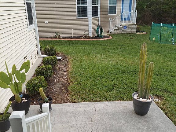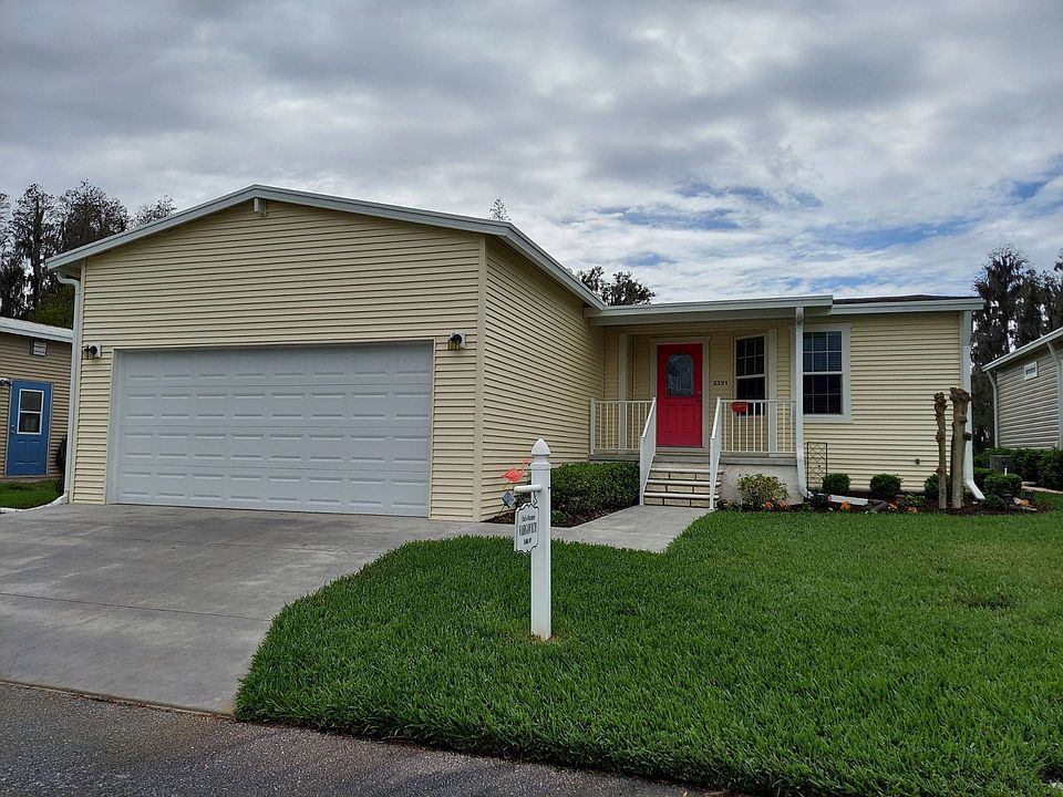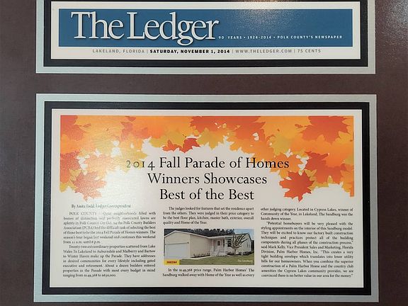 2014 Best of the Best Fall Parade of Homes Winner for sale. This 3 bedroom 2 bath triple wide Palm Harbor home boasts 1760 square feet of living space and a two car garage. Situated on a wooded lot with a rear facing screened in lanai, you can sit and enjoy the beauty of Florida's wild life. This open and split floor plan has carpet, trey ceilings, horizon windows, & crown molding in the living and dining rooms. The kitchen has a coffer ceiling with pendant and recessed lighting, tile flooring an island, tile back splash, glass top stove with built in microwave above and a new refrigerator. You will find carpet in the 3 bedrooms, reach in closets in guests and walk-in in master bedroom. The master bath has tile flooring, dual sink vanity, tiled walk in shower, soaking tub and shelving for linen. Guest bathroom has tiled flooring and tub/shower combo. The AC was just recently replaced, roof and hot water tank are 2014, and double thermopane windows are throughout the home. This is home is being sold Turn-Key. Home is on leased land. Call the Sales and Information Center for showing instructions.