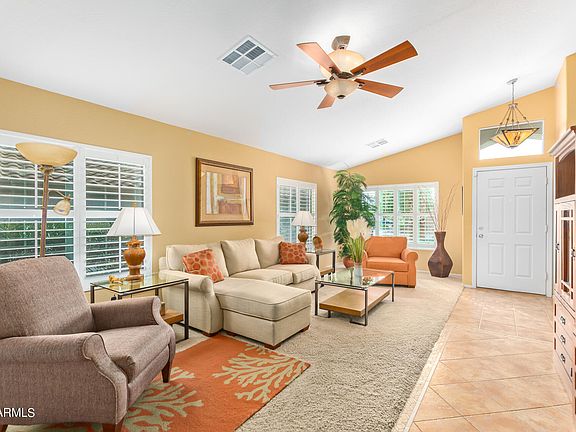Masterfully designed by Meritage, this beautifully maintained home is located on the 7th hole of the 55+ Sundance Golf Community. It features great curb appeal leading into the spacious fluid floor plan with tall ceilings and high windows for an abundance of natural light throughout. The great room features vaulted ceilings and leads into cozy kitchen which looks through to mountain & golf views and plenty of privacy.