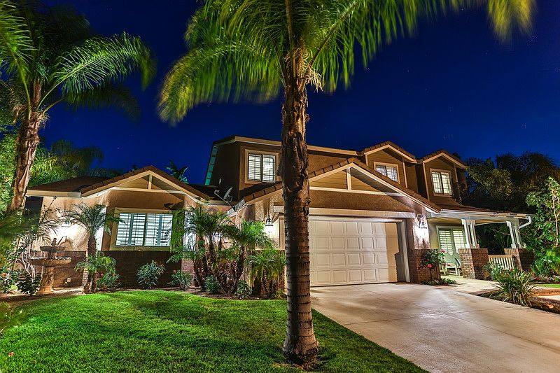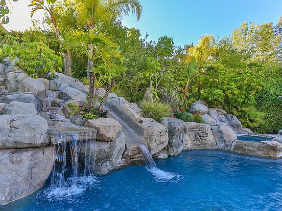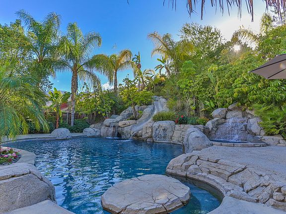 Enjoy resort like living everyday! This stunning home is sure to please even the most discerning buyer. Situated on a 1/3 acre culdesac lot at the base of the Cleveland National Forest, this amazing home is perfect for entertaining or your family's own private enjoyment. Incredible backyard with beautiful saltwater lagoon rock pool featuring 25' water slide! ...Jump rocks, waterfalls, cove, rock table with in pool seating, lighting built into the rocks, and a large spa with cascading waterfall flowing into it. A large barbecue island sits under a beautiful 21' two-tiered palapa! Relax or roast marshmallows by the gas fire pit or lounge in the shade of this beautifully landscaped tropical paradise. Large covered patio, garden, an adorable custom-built child's play house (w/sleeping loft, with lights, electrical and air conditioning), and a fun backyard play set. This amazing 3457sqft home has 4 Bedrooms, 2 1/2 baths, bonus room, large office, home theater, and concession room. Come inside to a wonderful light and bright open floor plan. Gourmet kitchen features upgraded appliances, granite countertops with subway tile backsplash, convection double oven, farm sink and large pantry. Master suite has a vaulted beam and plank ceiling. Master bath also has a plank wood ceiling, large walk in double shower, granite countertops, and spacious walk in closet. Enjoy an amazing custom built movie theater in your own home! First, go into your concession room with built in candy display case and popcorn machine and get a treat for the show. Then, enter your theater under the lit marquis sign and through the double theater doors. Have a seat in one of your stadium seating style 9 leather reclining theater chairs. Push the remote to draw back the theater curtains and reveal your 110" projection screen! Theater has incredible built in surround sound, lighting sconces and padded theater walls. Other features: Large home office with beautifully landscaped separate entrance. Upstairs bonus room with pool table. Large crown/base molding and plantation shutters throughout entire home. Too many amenities to mention! Low taxes/No Mello Roos!