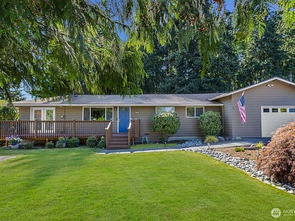Forest retreat meets modern living. Beautiful Mid-Century rambler is nestled against Shelton View Forest with trail access. This exceptional home features two primary suites plus a versatile third bedroom/office with Murphy bed, offering the ultimate in flexible living. Oversized garage can transform into your dream workshop, home gym, or entertainment zone. Updated kitchen with beautiful quartz countertops and abundant cabinetry. Original hardwoods and striking stone fireplace deliver timeless character. AC & Heat pump provide year-round comfort. Top-rated Northshore School District, Shelton View Elementary is blocks away! Fully fenced yard with dog run and large private deck. Easy access to freeways, shopping and restaurants. Must see