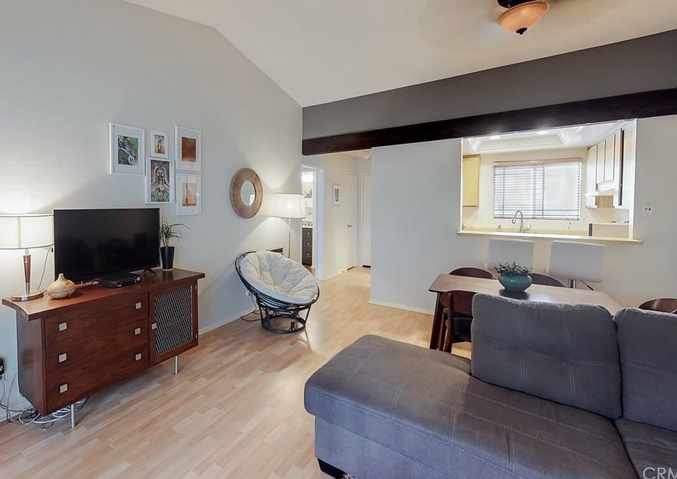 Take a look at this 1 Bedroom 1 Bathroom Condo, located upstairs in Mission Viejo. This cozy condo is perfect for a first time buyer, or an investment opportunity in South Orange County. This house has a ton of natural light and is surrounded with trees When you enter the home, you will notice vaulted ceilings and the upgraded flooring that continues into the Master Bedroom. The kitchen overlooks the dining area, and living room opening up the interior. There is a counter top separating the two that allows for additional seating for dining, or entertaining. The living room is spacious and has an attached balcony that has additional wooden lattice for extra privacy. On the balcony, you will find room for a washer and dryer. The Bedroom is very spacious and has a large closet for storing clothing and accessories. The bathroom has a full shower and tub, with an upgraded vanity, and upgraded counter-top. Mission Viejo has so much offer, as it's centrally located in South Orange County, closer to major transportation corridors, with endless dining and entertainment options. Make sure to view the pictures and 3D Tour! Don't miss out on this cozy Condo!