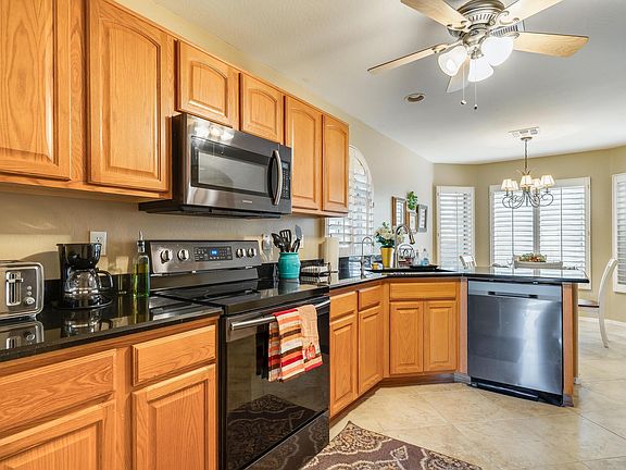 Gorgeous and fully furnished home on the golf course in Sundance Adult Village. All furnishings, appliances, patio furniture, barbeque grill and golf cart convey! Just bring your clothes and groceries and enjoy the views! Recent upgrades include all new appliances, French Doors leading to patio, Kinetico Soft Water System and front security door. Vaulted ceilings and plantation shutters make this home light and bright and open! Enjoy the peaceful setting on the patio with views of the golf course, lake and mountains. Stay inside the community for a round of golf, a swim at the community center or lunch at The Crooked Putter Restaurant. Or venture out for shopping and dining nearby or hiking at Skyline Regional Park. There's something for everyone!