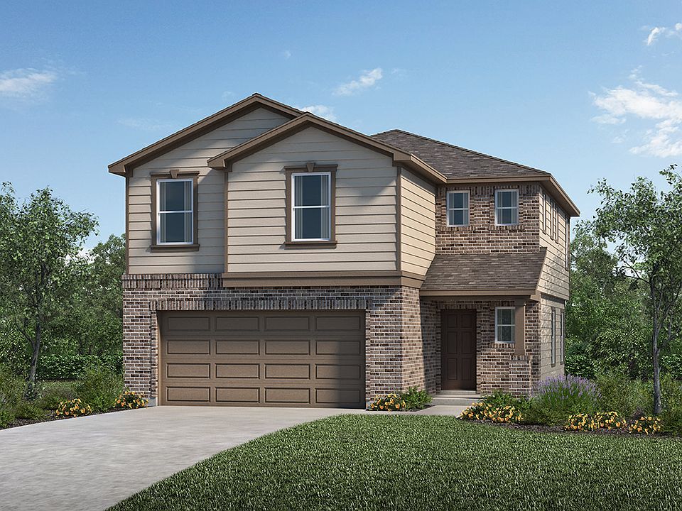 Fall in love with this lovely, two-story home, featuring a brick façade for extra curb appeal. Inside, discover an open floor plan with tile flooring, wrought-iron spindles and a spacious great room. Whip up culinary masterpieces in the modern kitchen, which showcases granite countertops, tile backsplash, pendant lighting, 42-in. upper cabinets and stainless steel ENERGY STAR® certified appliances, including a gas range. Upstairs, the primary suite boasts an extended dual-sink vanity, luxurious 42-in. Kohler Master Windward® tub and separate shower. Other distinguishing features include faux-wood blinds and whole-house gutters. A covered back patio provides the ideal setting for outdoor entertaining and leisure.