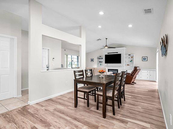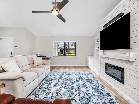 COMPLETELY REMODELED 3 bedroom 2 bathroom SINGLE STORY CORNER VILLA with 2 car garage across from the neighborhood pool!! No stairs here, it's all easy 1 level living. Remodeled kitchen with custom cabinetry, s/s appliances, quartz countertops, timeless subway tile backsplash, recessed lighting and a large pantry cabinet. There's even an eat in area off the kitchen along with a large dinning area. Great for entertaining or casual living. Inside you'll find beautiful and super durable PLANK FLOORING THROUGHOUT all the living areas and all bedrooms. Yep... No carpet anywhere here!! This OPEN FLOOR PLAN has VAULTED SMOOTH CEILINGS. Yes... No popcorn. ALL REDONE BATHROOMS featuring real wood cabinets, quartz countertops, new lighting fixtures and recessed lighting. The master bathroom even has the most amazing spa like shower with a large rain head shower head, shower wand and 6 body sprays on the wall. Enjoy the best outdoor living Florida has to offer from TWO SCREENED PATIOS, overlooking the garden area and neighborhood pool. Newer full size washer and dryer are located inside the villa under a/c the way it should be (not in the garage). Roofs, lawn and cable all included by the low HOA. Pets and non-commercial pickup truck are welcome too!!