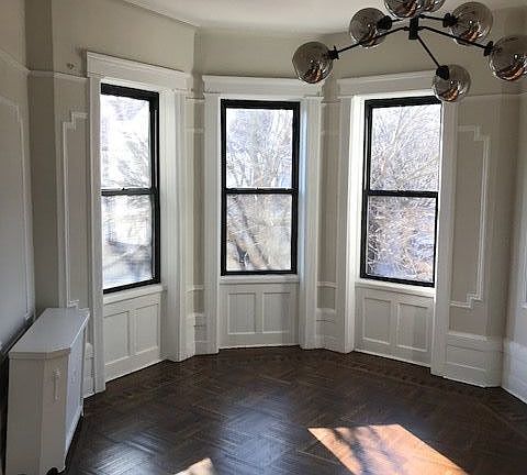 This newly renovated, top floor, 4 bedroom 2 bathroom apartment in a turn of the century brownstone showcases modern elegance and beautifully preserved historic details. From its original parquet floors, coffered ceiling, original stained glass windows to it's gorgeous sun exposures, this apartment is a true charmer. Upon entering the apartment, you will step into an expansive open lay-out living room, kitchen and dining area. The kitchen features stark white modern cabinets with custom walnut shelving and butcher's block counter-tops. The impressive bathrooms feature luxurious Carrera Blanco tile on the walls, Nero Marquina marble hexagon tile on the floor, Grohe fixtures, marble baths and shelves made of re-purposed rough-hewn antique beams. This apartment comes with 4 spacious bedrooms, 2 bathrooms, a terrace overlooking the backyard, and a dedicated full-sized washer/dryer. Requires First, One Month's Security, $75 credit check and Brokers' fee.