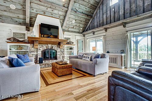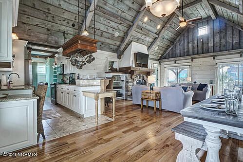 One of the most well-built and unique homes on Topsail Island has just hit the market! Sitting on a high elevation with federal flood insurance that is only $530/year. This home was built by a true European craftsman with attention to detail, quality and style. Featuring 3-bedrooms and 2 full baths all on one level make this home perfect for a primary, secondary or vacation rental. The home boasts a finished entry with an open concept living room with soaring wood ceilings. The walls are all wood with a light wash, perfect for easy maintenance and there is no carpet in the home. Warm wood floors and designer tile are throughout. The kitchen is fantastic with a copper farmhouse sink, a coffee bar and tons of storage w/ a full pantry. Check out the hanging pot rack! 2 sliding glass doors lead out to a massive covered porch with fantastic ocean views and breezes. The centerpiece in the living room is a wood burning fireplace surrounded by stone that you simply MUST SEE! The master bedroom has a lighted tray ceiling, his and her closets and a large en-suite bathroom complete with a copper soaking tub! Did you see also the swinging beds in the 3rd bedroom?? The yard has been professionally landscaped with native plants, lined with stone and accent boulders around swaying palms to create your own oasis with a truly tropical feel. The lot is ideal for an in -ground pool (check with CAMA and NTB for zoning/setbacks and permits) The beach access is only 2 houses away and the home features a large, enclosed outdoor shower. This home is being sold fully furnished minus the wood furniture on the front porch. It is Turnkey right down to the dishes and linens. Hop in a hammock and you are home! This is the home you have been waiting to see in N. Topsail Beach!