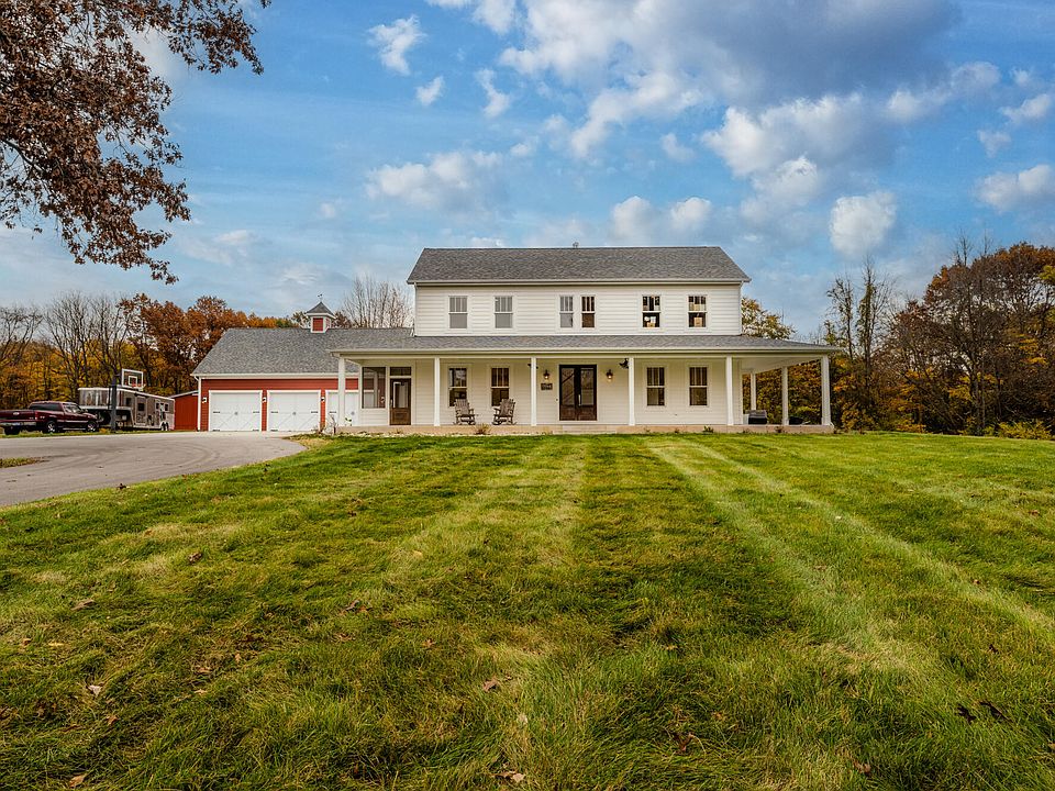 Incredible custom built home on nearly 14 acres of wooded trails and undulating pastoral beauty. Secluded country living, modern luxuries indoors and out, finished outbuilding, close to highway access and more. Main home offers 6 bedrooms, 4.5 bathrooms and approximately 5000 finished SF. Sizable bedrooms, bathrooms and play area upstairs, plus an unfinished great room above the garage. Main level primary suite, vaulted ceiling, massive fireplace and open kitchen/eating area. Quartz surfaces and hardwood floors nearly everywhere! Custom lighting, large island and plenty of both entertaining and storage space. Lower level walks out and has large rec room with hidden tv/bookshelves, additional suite, panic room and storage. Whole home wired for sound. Enjoy the changing seasons and breezes from the covered patio, elevated rear deck and lower level walkout patio space. Wander to the firepit area with framed in seating and enjoy an outdoor movie or just looking at the stars. Three stall attached heated floor garage with shower area and access to the dog's cottage. 3888 SF pole barn with finished interior, heated floors and boiler, floor drains, deep pads for hoists, 4 overhead doors with remote openers, concrete floors, heating/cooling, and workshop space that is plumbed for a full bathroom. All electric is buried. Pasture fence at side and front of the fully fenced in property.