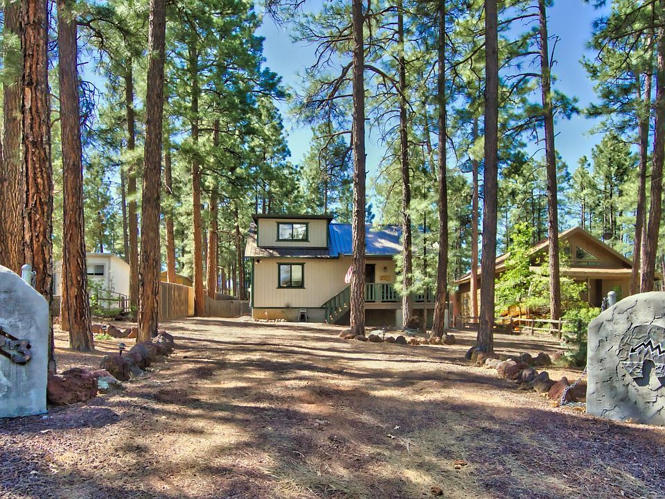 Welcome to this 2 BR + Loft, 2 BA, 1,234 sf cabin in Show Low! Found on a quiet ¼ acre lot, minutes from Fool Hollow Lake! Enjoy wood floors, T&G ceilings, newer kitchen counters, & warm tones throughout! D/S you'll find a cozy family room w/ gas stove, log accents, open kitchen w/dining, breakfast bar, storage, BA #1, BR #1, & laundry w/pantry! U/S is BR #2, BA #2, & Loft! Unique décor creates a rustic feel! Out back is a covered Trex deck, large backyard w/firepit area, storage shed, & space to expand! Room to park your RV & boat, new refrigerator in '23, newer oven, new HVAC added in '17, new metal roof in '16, new Trex decking added in '16, cedar-lined closets, natural gas, and no HOA! All sold furnished and ready for you to use on Day 1! Hurry, a gem priced this well will not last!