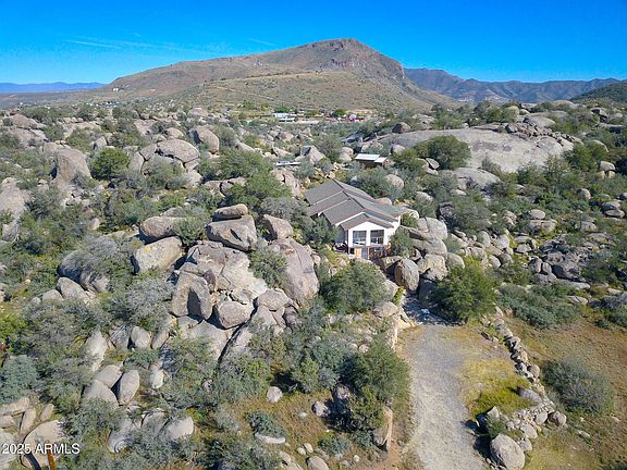 This home is located within the town of Yarnell in the lovely subdivision of Glen Lilah, the custom-built home is set perfectly into the elevated boulders. The main floor is level living with a front patio to take in the views. The lower level consists of 3 storage rooms one for storage and the other two are workshops. In addition to the home there is a large storage shed to back of the house. The property consists of two lots. One for the home and storage shed. The other lot has a large two car garage with easy access from the street. The land is rich with large boulder outcroppings and private alcoves. The front of the property has a nice level area for farm animals if desired. This unique property was built by a gentleman who took great pride in his craftsmanship. This unique property was built by a gentleman who took great pride in his craftsmanship. From the steel framing to the abundance of wood design throughout makes this a must-see property.