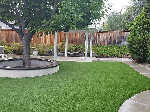 Front and backyards have artificial lawns. Backyard has cement area surrounding the yard with 6' diameter round sitting wall around central tree.