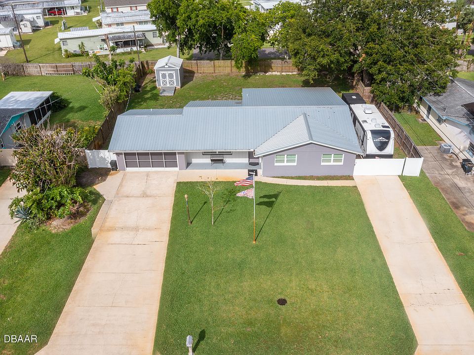 Fall in love with this renovated, beauty! Great, central location, high and dry in a no-flood zone! Less than 4 miles to the beach! So close to Airport, International Speedway, Schools, Hospitals, Shopping, Community Parks and Fabulous Restaurants! Two, deep driveways! On the garage side, the 1st driveway can accommodate many cars and garage comes equipped with 4 section screen door, Aladdin door opener with remote and cell phone capability. On the other side, the 2nd driveway was designed for your RV and Boat. The gate opens to super sized, concrete pad and a 30 amp hook up! This means you can park your RV/Boat/Camper/Trailer without paying for expensive storage! No HOA worries either! The irrigation system has its' own well, so, no additional water fees from the city. The yard is fully fenced to keep pets secure. The 10x15 shed with ramp will store all your gardening tools, + more. Another super sized patio makes for lots of outdoor fun. The metal roof was completed in (2016) and is a popular choice because of its' durability. Double pane, vinyl, impact rated windows have been installed (2017) and make for lower insurance bills and peace of mind! Front patio is so welcoming and has plenty of room for gathering with friends. Once inside, you will be WOWED by the new, open floor plan concept with custom Wainscoting, Plantation Shutters and French Oak Nutmeg- 12 mm laminate flooring! The Rustic Beam installed on the ceiling helps define these beautiful living area. Office/den and Kitchen. Speaking of Kitchens, this one boasts Silkwood Walnut Kitchen Plank tiles, a center island with cooktop and exhaust hood, Stratford ceiling tiles, sun tunnel, pendant lights, customized cabinets with built ins for wall oven and microwave and crown molding.