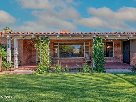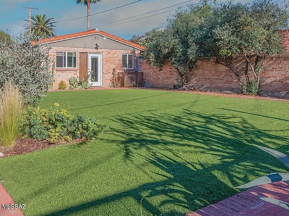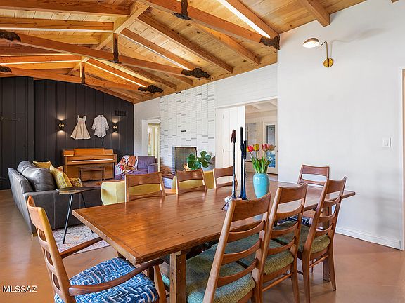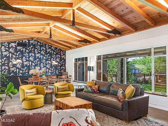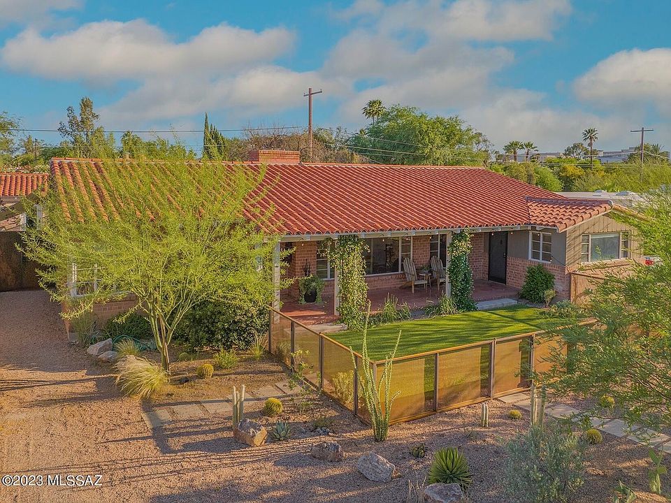 This rare updated Midcentury ranch house in the Catalina Vista Neighborhood is a beacon of style. The hand sanded wood beam ceilings, polished concrete floors, and exposed brick walls offer a stunning confluence of textures and contrasts which highlight the historic details of this superbly appointed home. Vintage and modern fixtures and finishes blend artfully throughout the main house with its three spacious bedrooms and an additional office/den. Primary suite has vaulted ceiling, walk-in closet, and en-suite bathroom. The custom alder kitchen cabinets, gourmet appliances, quartz countertops, and Heath Tile backsplash make this home feel beautifully balanced between form and function. A large synthetic lawn, low water native plantings, custom metalwork, and stunning mural create a captivating rear yard. Guest casita with kitchen and bathroom complete this phenomenal property all just walking distance to Banner University Hospital, The University of Arizona, and the famous Arizona Inn.