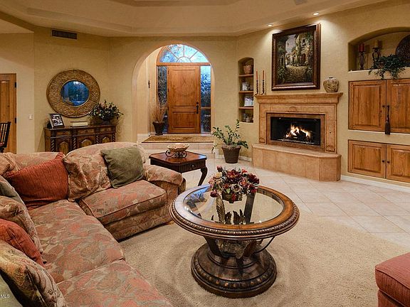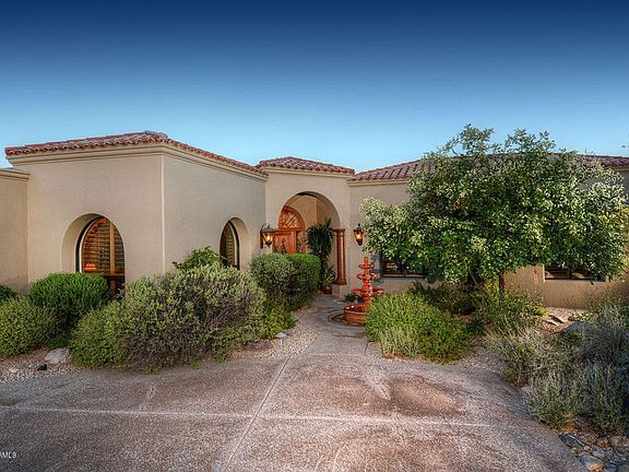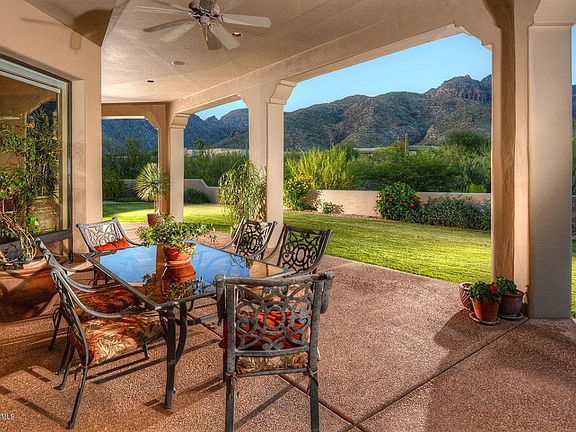 Beautiful custom home in gated Pima Canyon on corner lot with incredible mountain views & privacy. This solid masonry stucco home built by RB Construction, has an open floor plan & high ceilings. The large family/media room has a bar & home theater. Kitchen includes maple cabinets, double ovens and walk in pantry. Interior solid wood doors through out home. Lovely back yard has sparkling pebble tec pool with waterfall & spa.