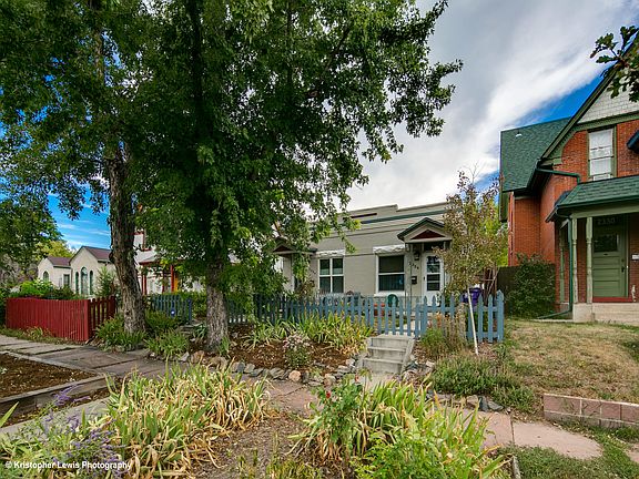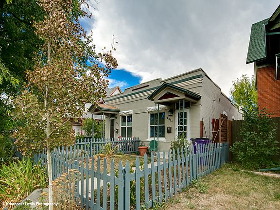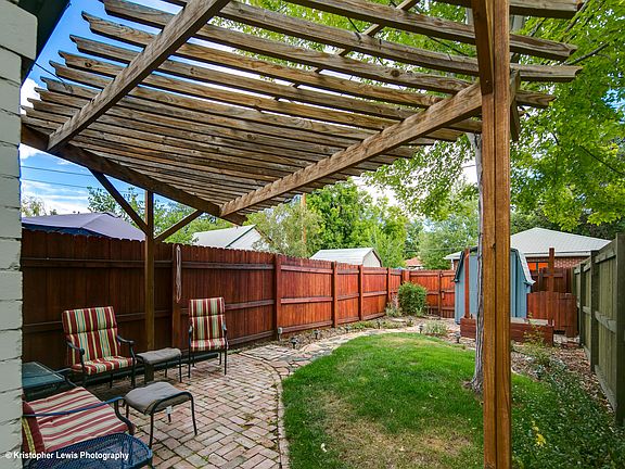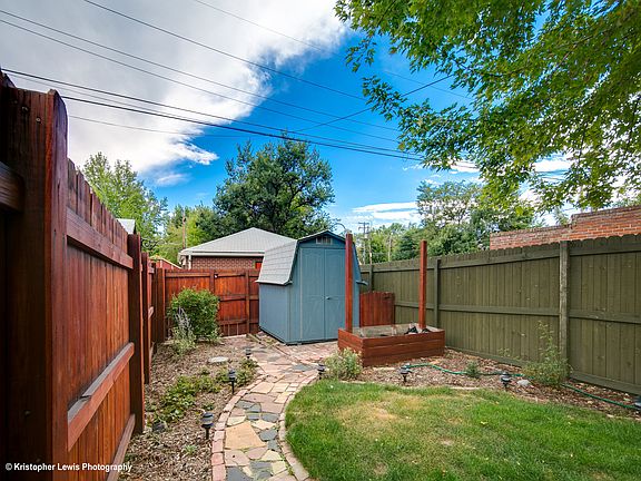 Fancy an English Garden? This charming row house presents that possibility and ever-so-many others! The pine floors and crown molding in the living room exude charm and grace. Exposed brick adds a touch of rustic character. Continue on to the dining area and kitchen with high ceilings bringing in the light, sparkling cabinetry and white appliances, including a gas stove, tile floors and plate rail shelving. Through the French doors to the first bedroom and then on to a second bedroom, both are light and bright. They share a well-appointed bath with ample storage and pleasant fixtures. A convenient laundry area is nearby. The basement offers flex space and storage along with the utilities. A fenced yard presents a covered brick patio, lawn and garden areas and even a storage shed. Plant your English Garden in the front yard framed in an adorable picket fence. Quaint!