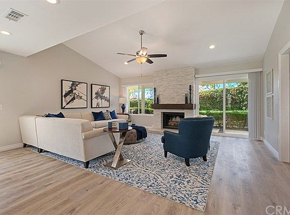 SINGLE LEVEL HOME ~ UPDATED TOP TO BOTTOM~ Upgrades of big ticket items including New Windows, Air Conditioning n Heater system with WiFi Thermostat. Desirable Casa Rosa floor plan is decked out with beautiful new floors leading to the dramatic and completely upgraded Open Concept Kitchen and Living Room. Fall in love with the welcoming Kitchen Island, with Quartz counters, spotlighted by Designer Pendant Lights and seating for up to 4 people. Entertain like a Pro, cook for guests utilizing New Samsung Stainless Steel Appliances. Your guests will enjoy relaxing in the spacious Living Room with Vaulted Ceiling and a gorgeous stacked-stone fireplace accented with a custom mantle. The Office/Den with custom built-in desk and organizers open to living room, which can also serve as a 3rd bedroom. The Master Suite is situated on a separate and private wing of the house and offers vaulted ceilings, custom closets, and dual sinks. The large Wrap-Around Patio and Yard can be enjoyed year round without the need to maintain the lawn, which is handled by HOA Manicurist. Park-like greenbelt close to home, great for pets to run or family picnics. Association Amenities in this Active Age-Qualified Community include Pools, Spas, Tennis Courts, Clubhouse and much more, dues cover 24-hour security, Exterior Paint, Landscape-Maintenance, and Trash Pick-up. This home is located in close proximity to Grocery Store, and Mission Viejo Lake for Fireworks, Concerts, Restaurants....