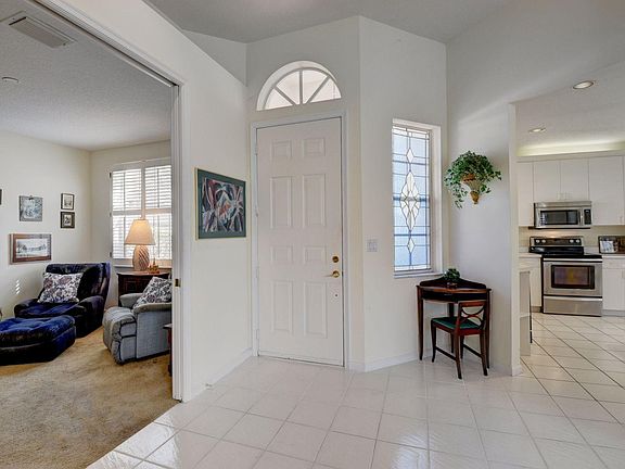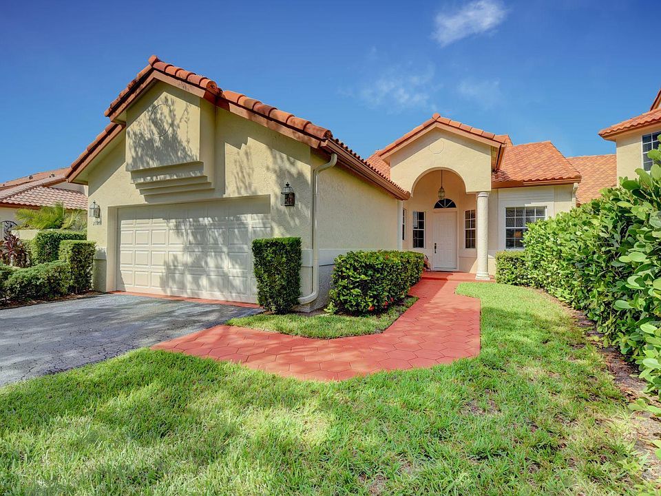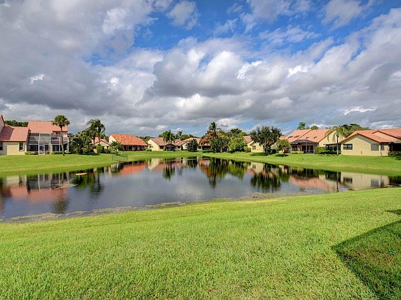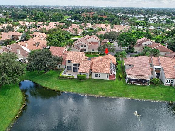 Rare, corner, lakefront villa in charming, gated, pet-friendly, Waterside, which is right on the Hillsboro Canal. Quiet, courtyard location, walking distance to community pool, cabana, tennis, and boat docks with ocean access. Please notice driveway is not shared with neighbor. Two bedroom plus den. White kitchen, SS refrigerator, range and microwave, bonus island, pass through to dining area, breakfast area opens to screened patio. Inside laundry room. Spacious great room with wall of sliding glass doors and clerestory windows opening to the screened patio. Totally private master suite also connects to the patio, with serene lake views from bedroom and bath. New S-tile roof in 2011 (note roof is separate from neighbors). Expanded, screened patio overlooking the lake. Call for dock info.