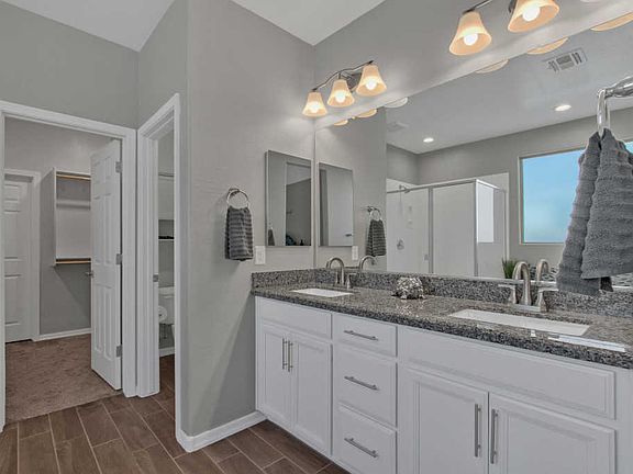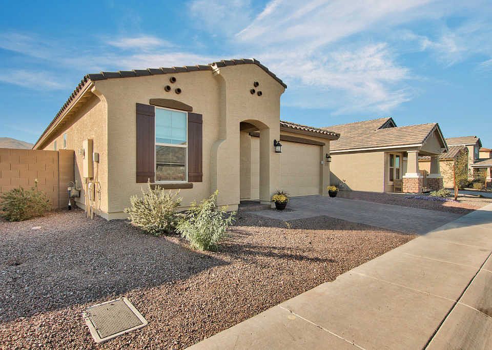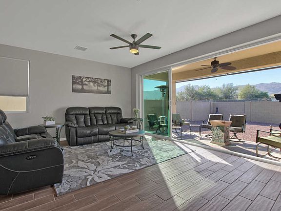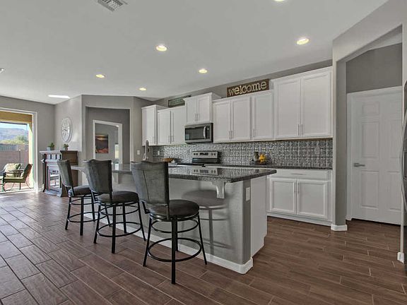 This 3 bedroom plus den, 2 bath, single-story home, built in 2019, features 1902 sqft of generous living space and a 2 car garage. Nestled in the new gated community of Mountain Trails West, this home boasts a paver driveway and a fenced-in backyard with a covered patio; the possibilities are endless with the backyard being wired for a hot tub and room for a pool. As you venture inside, marvel at the wall of stacking glass sliders, porcelain wood-look flooring and a laundry room with storage that can be accessed from the kitchen or through the master closet. The chef in the family will fall in love with the kitchen featuring granite countertops, an under-mount sink, white cupboards, stainless appliances, and a convenient walk-in pantry. There is so much to see in this new dream home!
