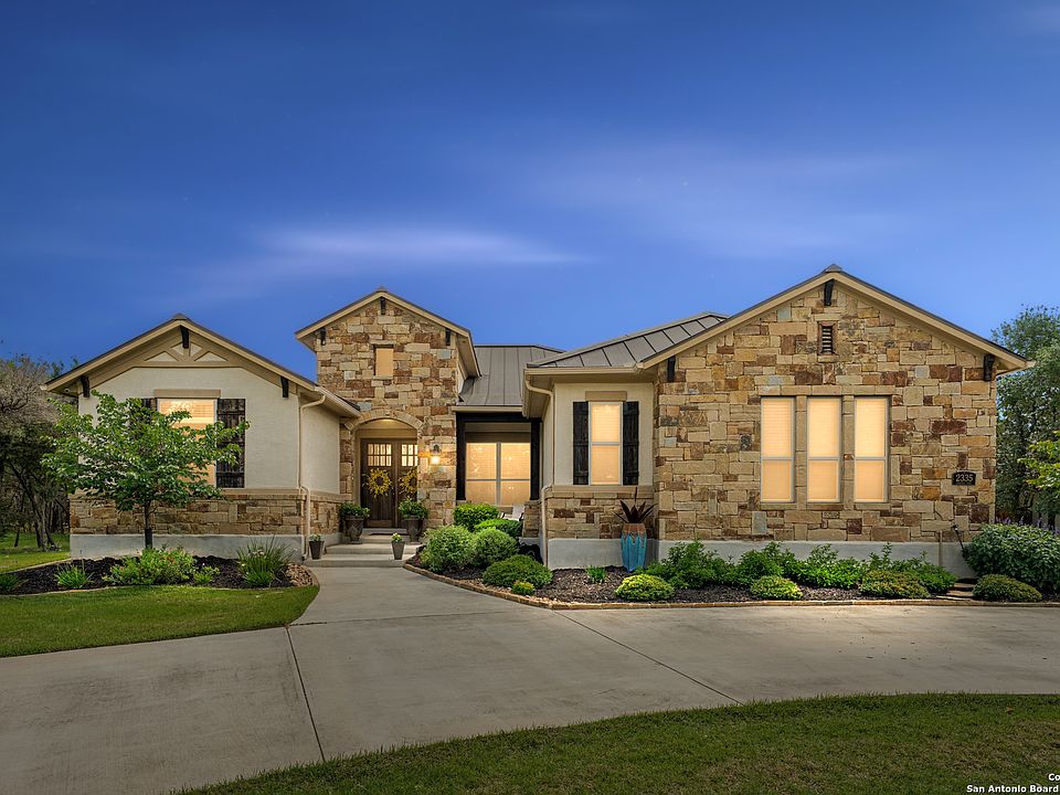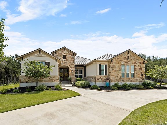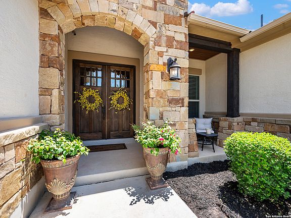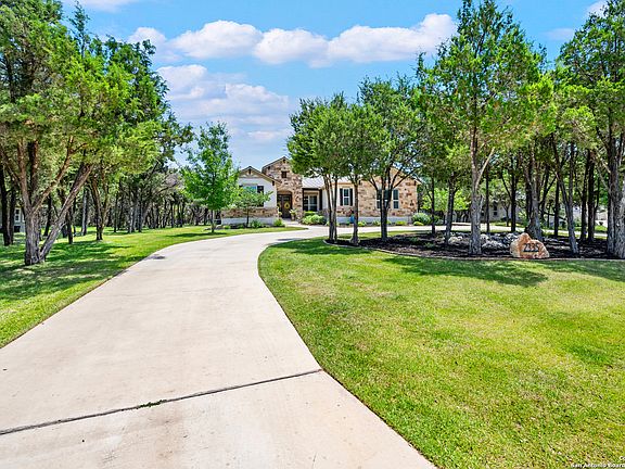 This immaculate single-story home, nestled on 1.12 acres within the prestigious gated community of The Estates at The Preserve of Mission Valley, exudes quality sophistication and timeless Hill Country charm. Perfectly situated five miles from H-E-B and just moments from downtown New Braunfels and the historic town of Gruene, this home offers the perfect blend of peaceful living and urban convenience. Here, you'll enjoy the tranquility of the Hill Country while remaining close to fine dining, boutique shopping, and local entertainment. A welcoming foyer introduces an interior that is both meticulously maintained and richly appointed, with a seamless blend of elegance and comfort. Builder upgrades are found throughout, including interior stone accents, upgraded fixtures, and vaulted ceilings adorned with cedar-wrapped beams in both the family room and the primary suite. An abundance of wraparound, seamless glass windows fills the space with natural light, creating a warm and inviting atmosphere. The open-concept layout is thoughtfully designed for both everyday living and effortless entertaining. At the heart of the home, the spacious family room is anchored by a dramatic floor-to-ceiling stone fireplace with gas logs, opening gracefully to a separate dining area and a gourmet kitchen. Designed to inspire, the kitchen is equipped with Bosch stainless steel appliances, gas cooking, double ovens, travertine backsplash, and generous counter space, including additional seating available at the oversized island breakfast bar. The split owner's retreat offers a private sanctuary, featuring a spa-inspired en-suite bath with dual vanities, a walk-in shower, and a jetted soaking tub-perfect for unwinding at the end of the day. A flexible fourth bedroom (current owners are using as a study) offers endless possibilities, easily accommodating a home office or study to suit your lifestyle. The outdoor living space is equally impressive, with a covered patio that invites al fresco enjoyment year-round. Complete with a built-in outdoor kitchen, a Coyote gas grill, and plenty of space for lounging or entertaining; the backyard is a true haven. Surrounded by mature trees and lush landscaping, this property offers the ideal setting for leisure, play, and peaceful reflection. Come experience the very best of refined Hill Country living in a home that combines upscale comfort and an unbeatable location.