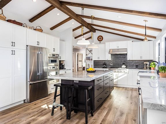 This stunning home is a rare find and won't last! Sitting on half an acre in highly desired Fire Mountain. This private gated compound boasts a single story Main Home with 3 bedrooms and 2 bathrooms A separate studio with electricity is perfect for a fitness/yoga studio or additional office space. The home's exterior features a pool, hot tub, multiple dining and relaxing areas, and room for an RV and boat as well as multiple garden areas. The Main Home has been completely remodeled with high-quality finishes. When entering the home you are greeted with a spacious and natural light soaring beamed ceilings, beautiful solid wood naturally aged doors and wide plank luxury vinyl flooring. The dream kitchen includes a one-of-a-kind full slab marble island, perfect for prep and eating, lava stone backsplash, ceramic farmhouse sink, shaker cabinetry, state of the art stainless steel Thermador and Bosch appliances, and French doors to the spectacular backyard. The Primary suite is completed with a built out walk-in closet, views of the sparkling pool, and spa-like ensuite bath with marble tiled shower and back splash, granite flooring, quartz countertops and jetted soaking tub. The additional bedrooms are two generously sized and share a gorgeous hall bath. The living room has a cozy fireplace that connects to a grand illuminated sunroom. Designer lighting and high ceilings, complete this home as large windows, and doors flood the home with an abundance of natural light. The property has solar electric generation to reduce all mothly costs.