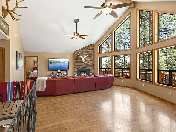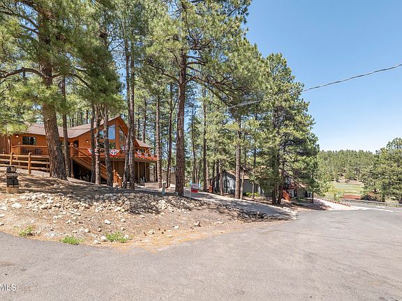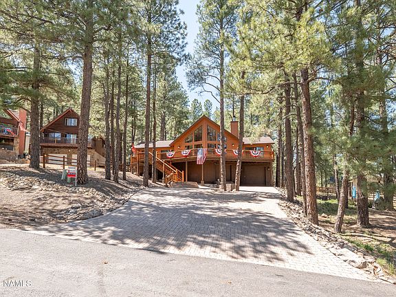 Stunning Chalet nestled among the pines on a large cul-de-sac lot with expansive views of the forest. Furnished and ready to use as a short-term rental, full time residence, or vacation home. The curb appeal is an outstanding example of what one expects in a Mountain community. A wall of windows provides abundant natural light and amazing views. Easy entertaining in the spacious great room featuring soaring vaulted ceiling. A gas fireplace with remote creates a warm and inviting atmosphere! An open kitchen includes all appliances, gorgeous custom cabinets, high quality granite counter tops, and a large walk-in pantry. Stay cool on warm days with central air conditioning. Enjoy Flagstaff's Mountain climate on either of the large decks! The rear deck is pre-wired and framed for a Hot Tub. A fire pit in the back yard is surrounded by Adirondack chairs. This home is impeccable! Truly a turn key property that includes all indoor and outdoor furnishings, kitchen supplies, linens, and even a Christmas tree with mountain style ornaments! This is a ready to move into, very well maintained home with quality finishes. Close proximity to downtown and all that this wonderful area offers!