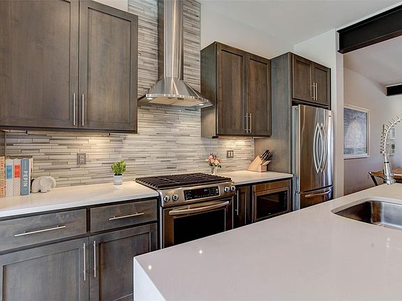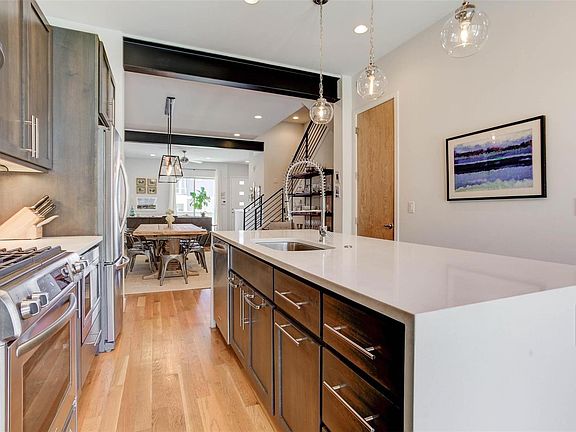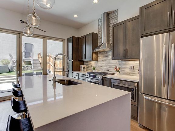 Stunning row home in the heart of Jefferson Park. This house is perfect for those who love to entertain! Main floor open floor plan with living room, dining room, and kitchen. Accordion glass doors span the full wall from kitchen onto covered patio and backyard, creating great indoor-outdoor flow. Beautiful, modern kitchen and bathrooms with custom cabinets and quartz countertops. The second floor offers a spacious master suite with private balcony and spa bathroom, a second bedroom with ensuite bathroom and balcony, and laundry. On the third floor, enjoy a 3rd bedroom, full bathroom, plus flex loft space and large deck with great downtown views! Large 2-car detached garage with additional overhead storage. Includes an Ecobee smart home thermostat, security system, and is wired for sound indoors and outdoors. Central location across the street from Jefferson Park, plus walkable to many shops and restaurants. Easy access to downtown and I-25.
