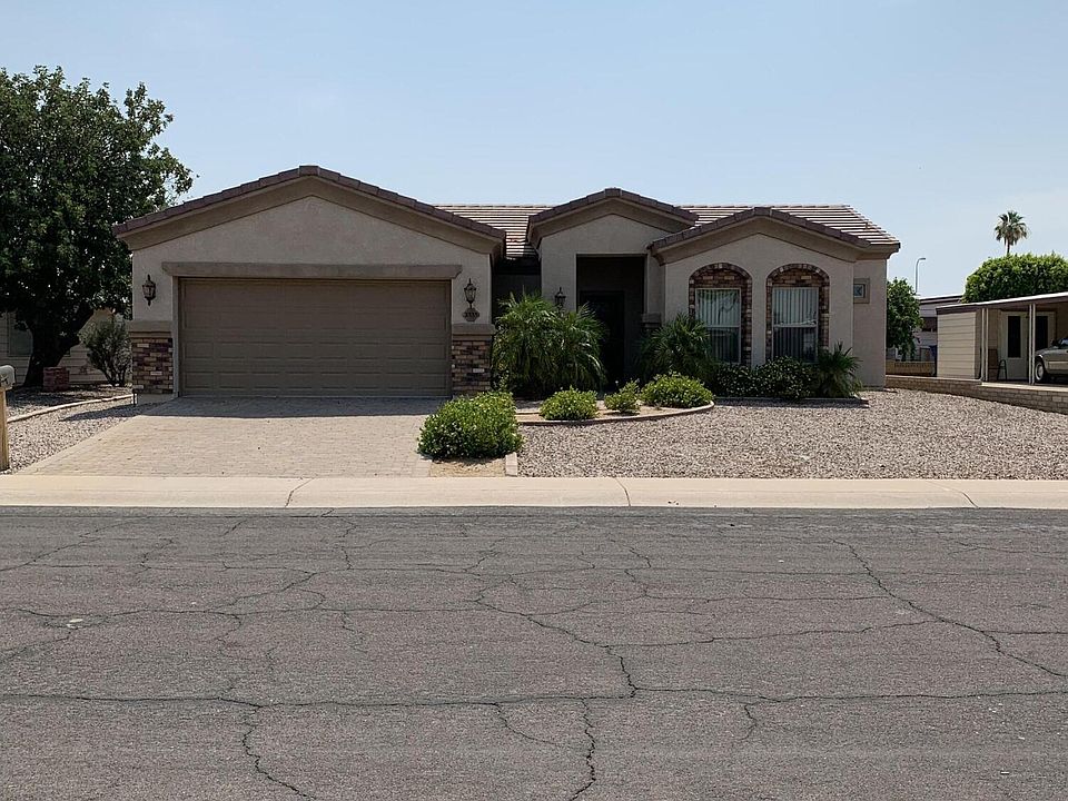 Beautiful rental in 55+ golf community of Apache Wells. Spacious open floor plan with dual master bedroom layout with 3rd bedroom/den/crafts room. Very large master and great ensuite master bath and shower. Large laundry room, nice 2 car garage and entry area builtin desk. Easy care front and back yards. Back yard with nice covered patio and lots of privacy!! Apache Wells has wonderful amenities including wood shop, crafts and arts, cards, workout facility, pool and spa as well as restaurant and bar. A must see rental--tenants must be over 55.
