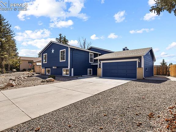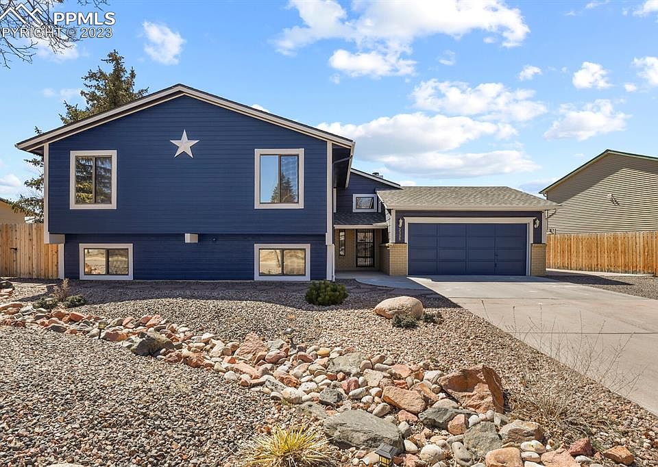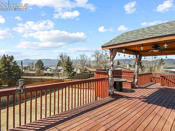 NO HOA!! This house has the curb appeal! Very attractive all around. Front yard is beautiful with rock & natural landscaping, poured pad on the west side with 30 amp plug-in for an RV! Backyard features a massive deck with cool mountain & Pike Peaks views that will stun at sunset. Large foyer entry with tile floor, vaulted ceiling and skylights on the upper level. TOTALS: 3046 finished square feet with 6 Bedrooms & 3 Baths. Over 1650 square feet & three bedrooms on the upper level & nearly 1400 finished square feet & three bedrooms on the lower level. Great room concept living/kitchen/dining. HUGE kitchen with a PARTY ISLAND that easily sits six stools and the space is impressive with lots cabinets & counter space. 5 burner gas cooktop with pot filler faucet! Brand new wall oven & Brand new built-in microwave. Stainless steel drop-in farmhouse double bowl kitchen sink with window above. Cool sunroom off the kitchen is a great flex space for pantry & other multi-uses. Daylight Lower Level rec room has a brick fireplace wall with hearth & mantel, there's also a wet bar & game area. Oversized laundry room has cabinets & closet and lots of other storage throughout the house. Really nice backyard with grass on auto sprinklers, large patio with door to direct garage access plus an oversized gate on the RV side. Deck has multiple spaces that extends the living area to the outdoors including a lower level that would ideally fit a hot tub with the power already in place! Furnace new 2022. Central AC. Whole house attic fan. Roof replaced 2021. Newer exterior paint. Upgraded carpet. Freshly refinished bamboo floors! All appliances including Refrigerator, Washer & Dryer will remain.