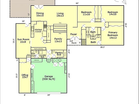 - Room types: Office, Sun Room, Laundry, Bedroom 2, Bedroom 3, Dining Room, Family Room, Kitchen, Living Room, Primary Bedroom