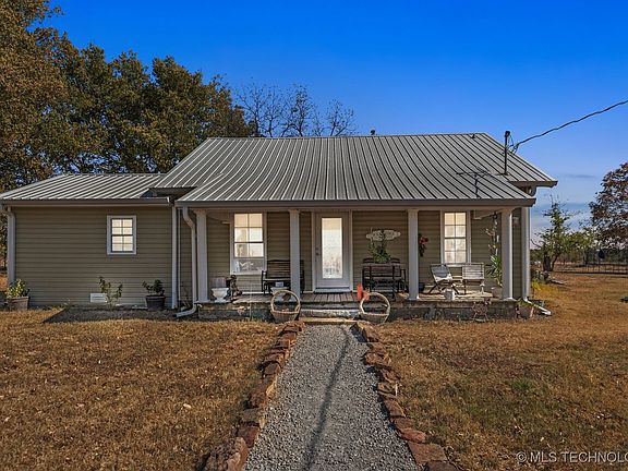 Charming farm house situated on 7 acres mol. This quaint farm house is located in the heart of the Amish countryside with easy access to Pryor and MAIP, Tulsa or Springdale. Awww! feel the stress drift away when you step onto this picturesque small farm complete with a historic barn and small pond. The home has been lovingly updated and has a pretty farm kitchen, large utility/mud room, 3 bedrooms and 2 baths, formal dining and beautiful covered front porch for coffee sipin. The property is fenced and cross-fenced and ready for your livestock. The beautiful farm house has been updated in the last 5 years with CH&A, Kitchen floors & sub-floors and beam, ship lap, cabinets, countertops, farm sink, dishwasher, elect stove, garbage disposal, New flooring on bottom floor, replaced stairs, light fixtures, paint, trim, upgraded 100 amp to 200 amp service. Electric run to front and back porches and to shed and new guttering added. Electric and water hook up for RV. The home has a metal roof and vinyl siding and is the perfect spot for your future. seller is doing floor repairs needed to allow the home to qualify for FHA financing