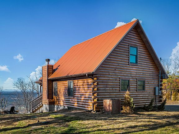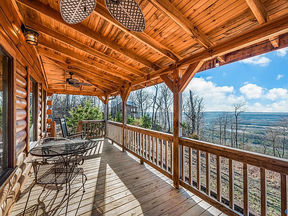 SUNSETS & PANORAMIC VIEWS for MILES...This brow log home is quaint and cute with high ceilings, rock fireplace. 3 bedrooms, 3 baths (one per each bedroom). Open living space with loft, kitchen, dining and living room. Relaxing back covered porch and so much appeal.