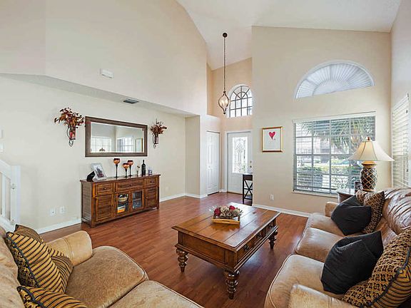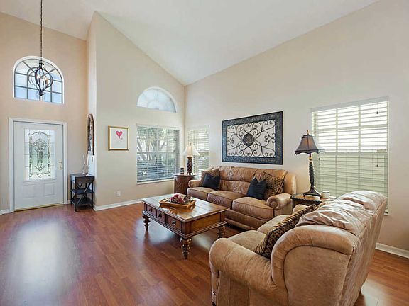 Spacious & light two story pool home on large corner, fenced lot in the guard gated community of Meadow Lakes. Resort style backyard makes you feel like you're on vacation w/plenty of room for kids or pets to play. Open living/dining room w/high ceilings has laminate floors. Kitchen & family room have beautiful porcelain tile. Pretty powder room w/wood vanity & vessel sink. Eat-in kitchen w/stainless steel appliances, lots of corian counters, updated cabinets, snack bar, pantry & recessed lighting overlooks screened porch & family room. Accordion shutters. Impact front door. Master Suite upstairs has laminate floors, walk-in closet, double sinks, soaking tub & separate shower. NEW AC in July. NEW LG washer & dryer approx 1 year. Exterior painted 2020. Community pool, tennis & play area.