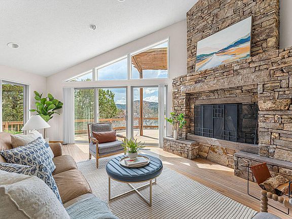 Lakefront home is a dream with lake views, stone fireplace, hardwood floors, open floor plan, and high ceilings. BOAT SLIP AVAILABLE behind home! The large native stacked stone Rumford fireplace is wood-burning with a propane starter. The primary bedroom and second bedroom on the main floor have huge walk-in closets. The primary bathroom is a dream with walk-in shower and jetted tub. The kitchen is open to the living areas, with stainless fridge and range, and cabinets with excellent custom pullouts. The dining area features a large beautiful stained glass light fixture. No steps into house, plus 36''w doors. Downstairs is a room that was used as an office but could be an exercise room or bunk room for the kids. Downstairs is a large apartment, w/ open floor plan, a new spacious separate bedroom, full kitchen, and full bath w/double sinks and large tub/shower. This high-ceilinged apt with lake views could be an in-law suite, a suite for visiting relatives or an investment apartment for short-term or long-term rental. A large John Deere room has space for the golf cart, a spacious workshop area plus half bath. Lots of storage space downstairs including a concrete room that could be wine storage, or a safe room. 2 NEW HVAC units. Perfect for a large family or extra income! Two car attached garage has 50amp for EV charging. Incredible deck space over 800sf overlooks the lake, plus side for grilling (propane) or the front yard.