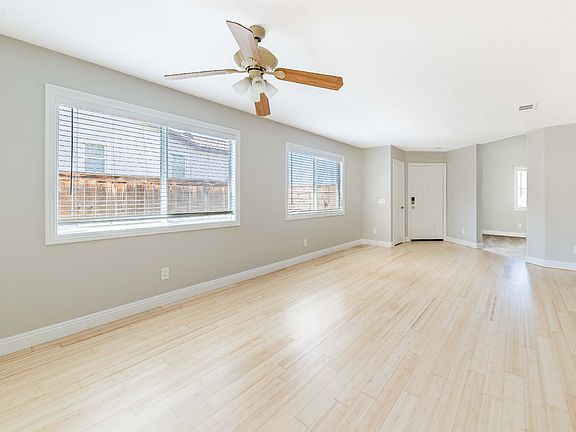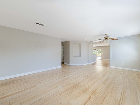 This beautiful home has upgrades throughout, including laminate flooring, designer tile, and new carpet. A great open design, 1 story with natural lighting, huge living room, family room with back door slider, and 3 good-sized bedrooms, including a master bedroom with dual sinks, a bath/shower, and a walk-in closet. Ceiling fans in every room. Quality washer, dryer, and refrigerator are included. The spacious 2-car garage has epoxy floors, perfect for car or bike enthusiasts. The backyard offers privacy with no neighbors behind and a covered patio with built-in fans. This house is a must-see!