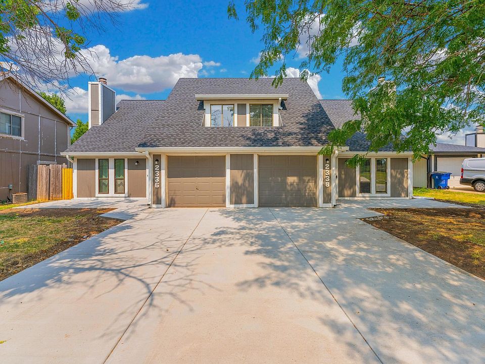 Welcome to 2336 and 2338 S. White Oak! This full duplex is a great investment opportunity, especially with its proximity to McConnell Air Force Base. 3 bedrooms and 1.5 baths on each side! Great area and minutes away from shopping and restaurants. BRAND NEW UPDATES INCLUDE NEW OVERSIZED GUTTERS, NEW FENCE, NEW DRIVEWAY, NEW FLOORING, NEW FAUCETS, FRESH GRADING AROUND HOUSE, UPDATED FIXTURES, AND TREE WORK PLANNED. Also, the units have fresh interior paint, stainless appliances, along with a newer roof for both units. This duplex offers attractive features for potential renters or owner-occupants. The spacious layout, vaulted ceilings, and floor to ceiling fireplaces add to its appeal. Washer and dryer hookups on both sides and each side has a single car garage and room for 2 more vehicles for each side in the driveway.