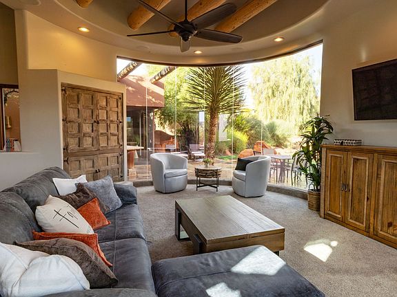 This Southwest-inspired villa in Kachina Springs at Entrada offers a seamless blend of luxury and comfort. Its distinctive circular architecture, sweeping glass walls, and striking red-rock vistas create a truly captivating setting. The home features 3 bedrooms and 3 bathrooms, including an oversized casita with a private entrance and its own living room. Additional highlights include a basement theater, Brazilian granite countertops, and expansive outdoor living spaces enhanced by a tranquil waterfall. Located within Entrada's prestigious gated golf community, the home embodies the best of Southern Utah living!