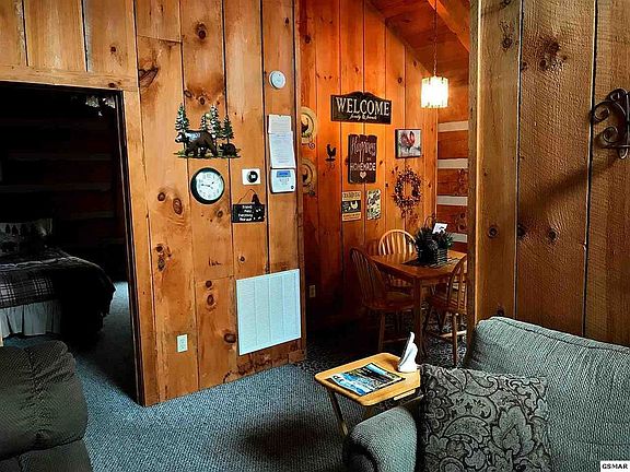 This one bedroom, one bath true log cabin situated just off Bluff Mountain Road has some amazing views (and with a little clearing even better) from the large covered back porch just off the living room. Sit in one of the rocking chairs, a porch swing, or relax in the hot tub before going in and warming up in front of the fire. The bedroom which currently houses a queen bed, has ample space for a king and in the corner of the bedroom is a large whirlpool tub, the separate bathroom also contains a stand up shower. Also located in the bedroom (currently being used as an owners closet) is washer/dryer connections. Cabin comes fully furnished and is ready to become a great investment for someone!
